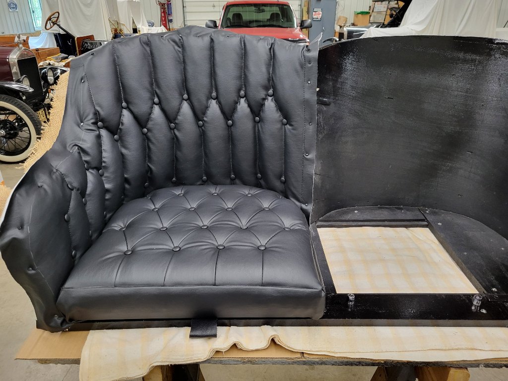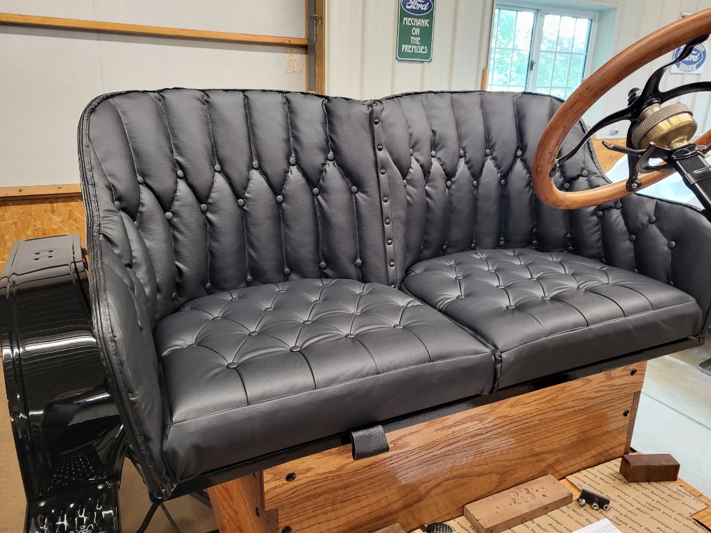 I started with a barn found seat frame, possibly 1910 Era, maybe from a Model N maybe not. Using a partial original seat back upholstery and a lot of liberty I have finally finished a seat upholstery project. I had not done this type of work for many years so my memory was challenged quite seriously.