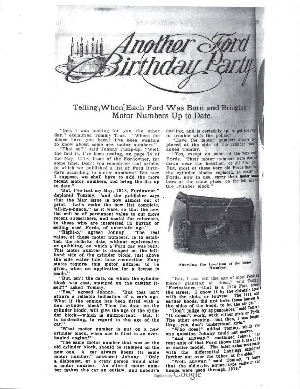 The following may help pre 1920 Ford Owners. The article is from the Ford Owner June 1919. During the life of the Model T the FMCO would list production and motor number in their in house publication the Ford Owner. In May 1913 a list of motor number was published, it was used to identify the year of manufacture, provided the motor was not changed.
