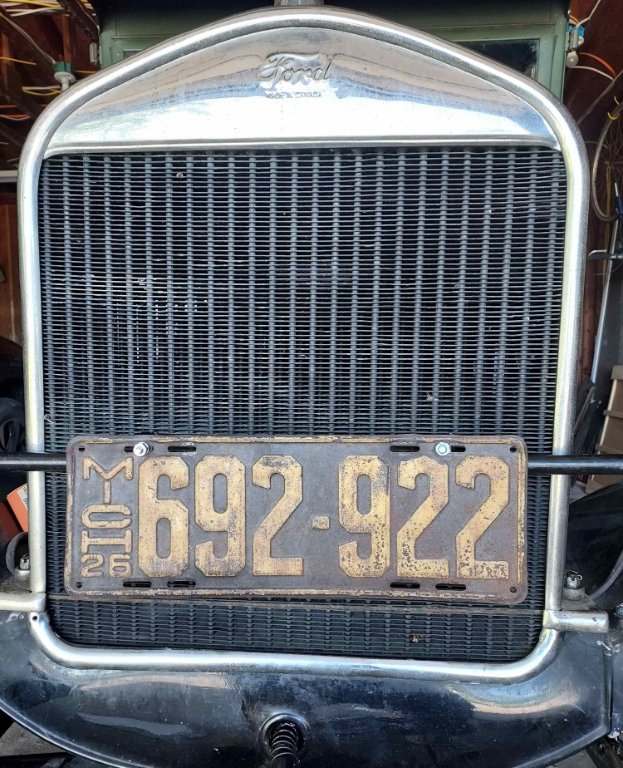 When I acquired my 1926 T back in the 1970's, the front license plate, a modern historic vehicle plate, was mounted on the headlight bar with 2 rubber coated adell clamps. I eventually used a 1926 Michigan YOM plate and mounted it on a bracket under the radiator on the front spring clamp thinking it would improve radiator airflow, and I'm sure it did. Now I am adding Ford bumpers and want to move the plate up higher. I tried using the Model A clamps to mount the plate to the headlight bar and find the license plate is too low and sticks out too far and interferes with the hand crank. Lots of older posts on this subject including the 15th million T coming off the assembly line with 2 clamps on the headlight bar w/o a plate, and another pic of the same car with the Michigan dealer plate "3M" attached on the headlight bar, although a 2 digit plate is rather small compared to my 6 digit plate. What do others do? Anyone mount to the front bumper? I may have to go back to under the radiator again.
