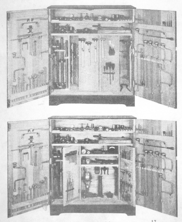 In my opinion, it is one of most desirable KR Wilson to own. It holds all of the components of the KRW combination machine (except for the machine itself), and has slots for all of the KRW transmission jig reamers. In addition it has hangers for almost all of the Ford Z tools. It also has hangers/keepers for the numerous other tools KRW supplied with the cabinet, including Slocomb micrometers, Starrett punches, and Browne & Sharpe machinist square.