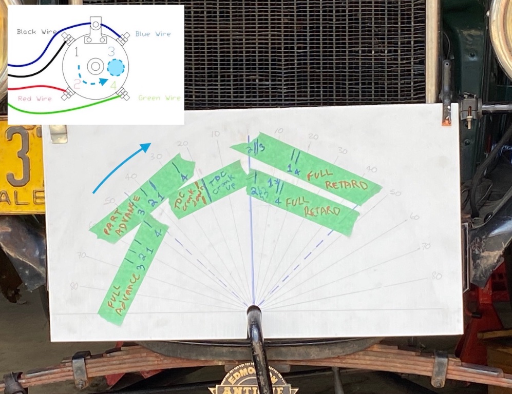 If so, then my initial timing is way off, as first spark at full retard on Batt occurs when the hand crank is 40 deg ATDC. This is consistent over cylinders 1, 2 and 4. Cylinder 3 is 10 deg sooner; a different issue and I’m pulling the timer to investigate.