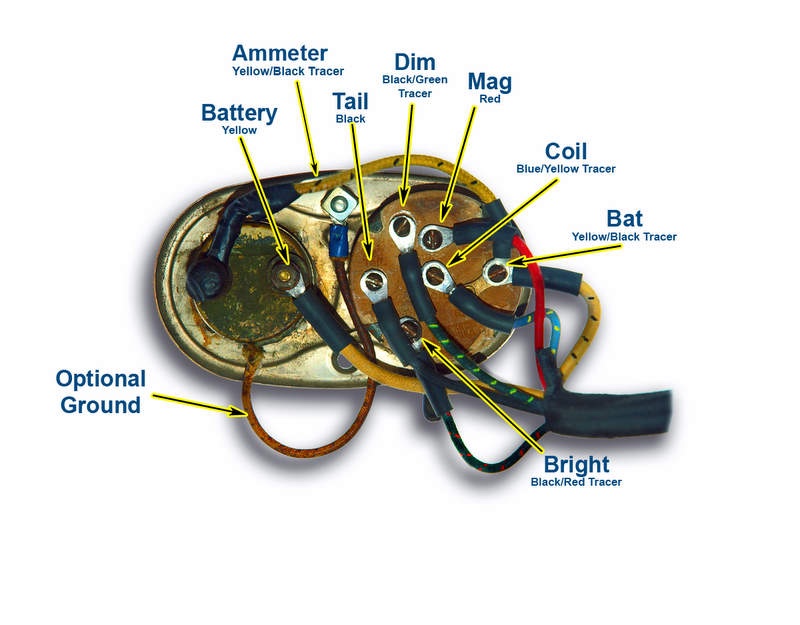 There is a difference between the photo and the diagram. In the Photo, the "bright" headlight wire goes to 5 on the terminal strip and the "Dim" to 6. On the diagram those two wires are reversed. Not a big deal but confusing.