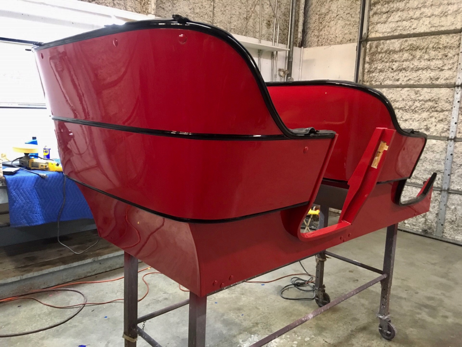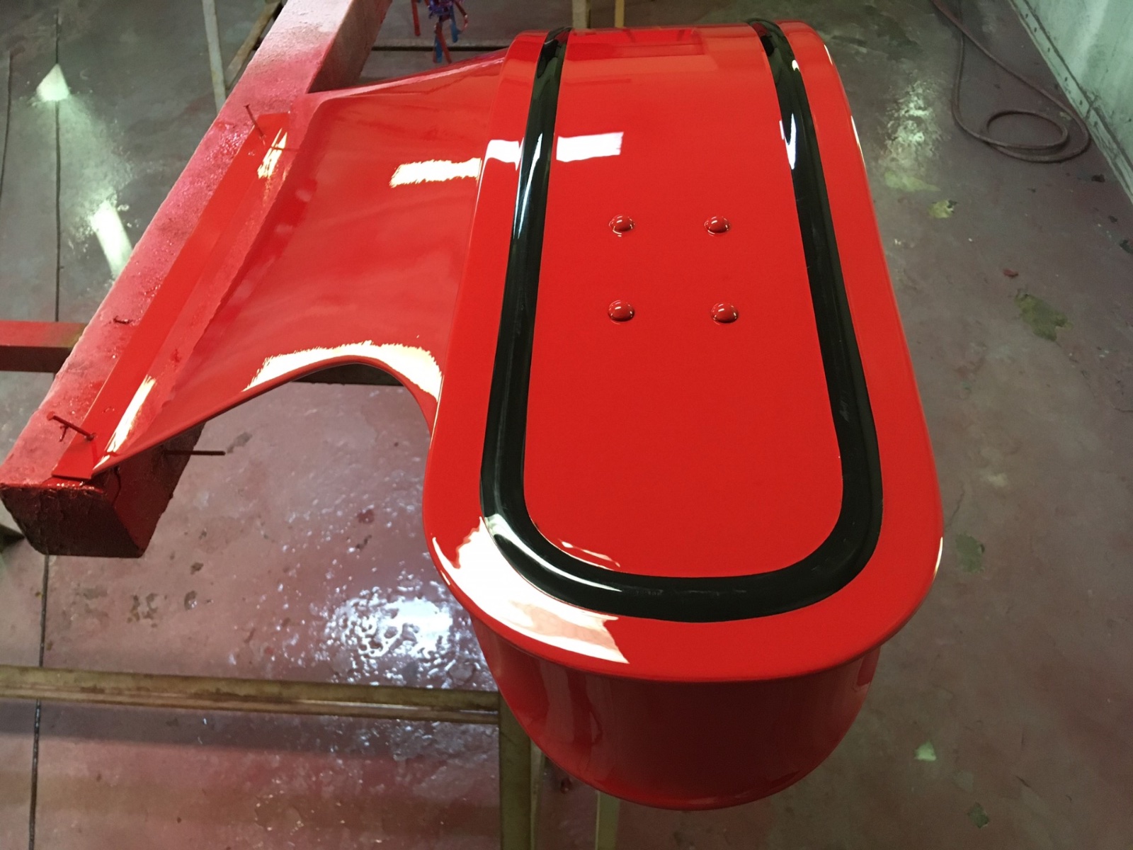 After a break to spend our 10th anniversary together with my bride, I’m trying to get back on this project and get the paint work done and get it assembled. Shot front fenders this morning. I had already painted the tops black and taped off the beads and had painted the bottoms red and masked them off. So set them up and painted the tops red. Then while the paint is still wet I pull the tape so the edges lay down and you get a nice transition. You DONT want to drop the tape in the paint. These should be dry enough to move out this afternoon and I can move in the rears and get them shot.I think everything red then has color on it. It took almost 3 of the 4 gallons of color to paint the car.