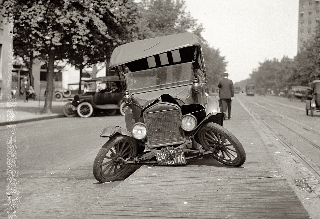Agree, contact with a streetcar head on. Perhaps both were slowing but sure can see point of impact. Smack into the hand crank, bent it in, and point was right between the twin license plates that are caved in. The axle folded under, and rest of the front end took damage from the impact.