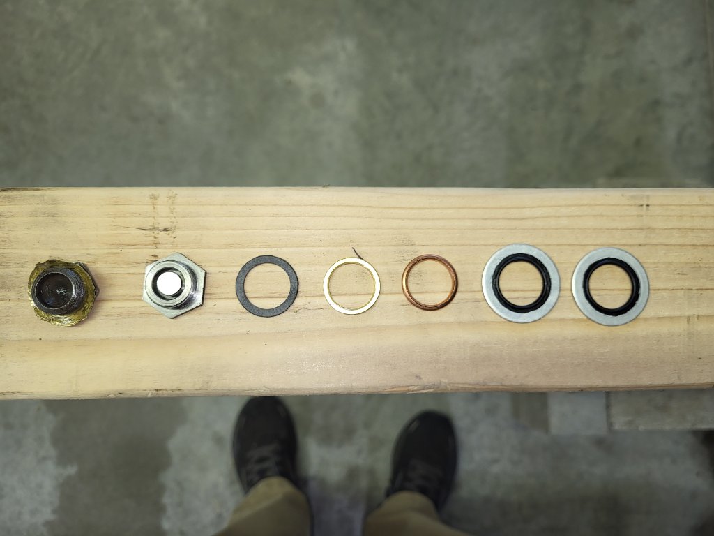 The last photo shows the original plug, the new plug, a fiber washer, the copper washer, the crushable washer, two washers with a rubber seal. I did not use the washer with rubber seal because it looked odd to me.