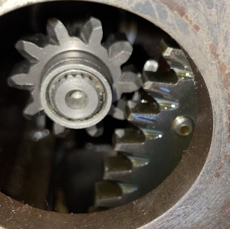 Here's a pic looking into the starter mounting hole - you can see the ring gear on the flywheel and the end of one of the slingers. Thought I'd also take the bendix cover off to get a better view. As always, thanks for any and all guidance/advice/wisdom you can share.