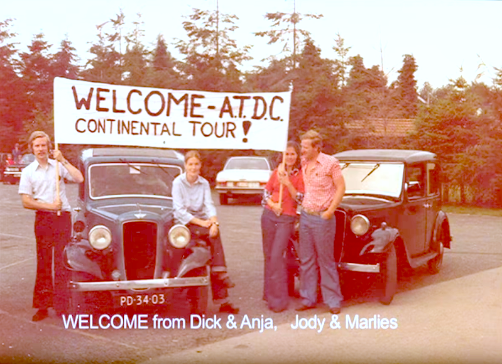 Several of the Dutch ATDC members decided to drive to Zeebrugge, meet the English folks and join them on the tour. We even made a welcome banner (black paint on an old sheet) for their arrival. In the picture, I am at the left, holding one side of the banner, and Anja is sitting on the fender of our Austin, a blue sedan with license PD-34-03. Since, like Model T's a decade earlier, the Austin was intended to be fairly basic transportation, Austin owners also are pretty down-to-earth people without much in the way of pretensions. With brewery visits, communal barbecues and pancake suppers, sightseeing, etc., we had a great time. (We were also now hooked on touring.)