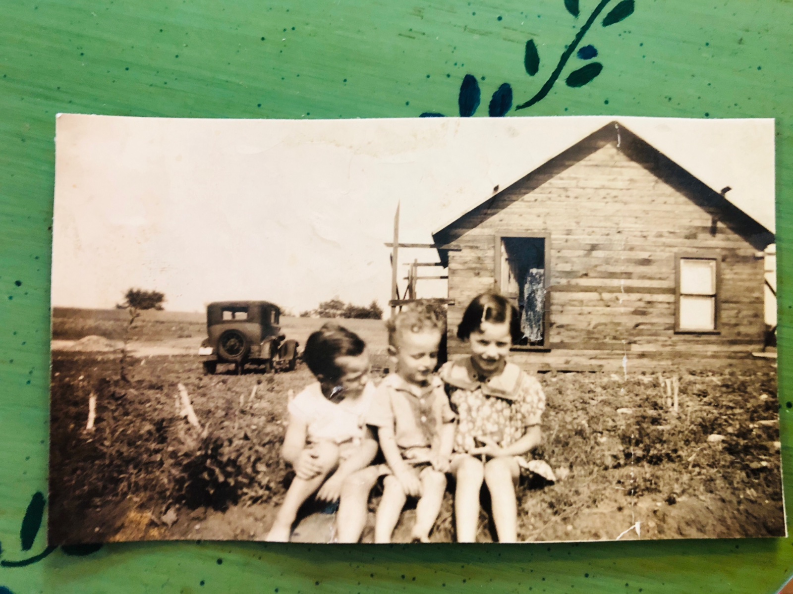 The car in the family photo background looks like a 1929 Model A Ford. The wheels are 21" and front fenders are late 1928-1929 A. The beading along the body belt line looks more like 4 door blind back,with two bumps and not large flat area, but it is not very clear in photo on my computer and I can't see the cowl. If the body belt is the large flat area then it a 2 door.