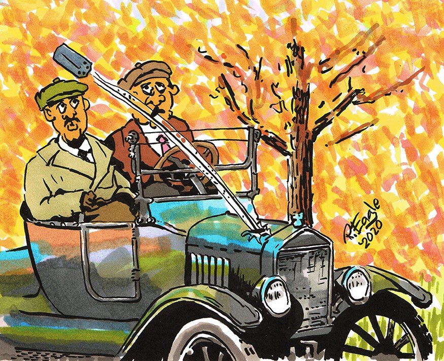 Rich Eagle graciously allowed our club to use one of his drawings on a club T-shirt. The idea was because we were coming across so many unusually mechanical conditions when we worked on member's cars....coining the motto "Never saw that before!" The cartoon shows a fan blade exiting thru the hood of a Model T - fortunately we haven't seen that but have seen some metal fans requiring replacement. Personally, I would never go with a plastic fan for a number of reasons. I did, however, replace my original 1917 fan with four riveted blades for one consisting of two double blades, one crossed over the other. After smoking a fan belt due to a stuck fan pulley I also installed a ball bearing unit which has been trouble free.