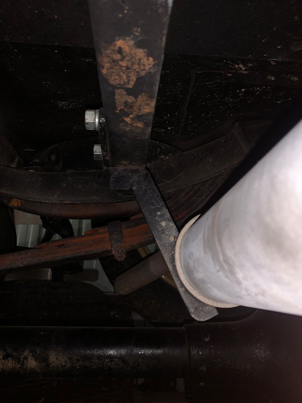 This might be a little hard to make out but I build a bracket from 1" angle iron, bolted it to the frame in the muffler hole and put a U bolt around the pipe.