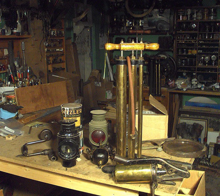 There is so much wonderful stuff to look at here. The clawfoot display case and the assortment of jacks. Horn and light displays, tire pumps of all kinds. I have one of the accessory windshields hanging above.