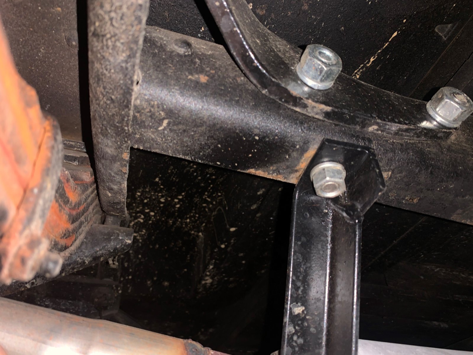 This might be a little hard to make out but I build a bracket from 1" angle iron, bolted it to the frame in the muffler hole and put a U bolt around the pipe.