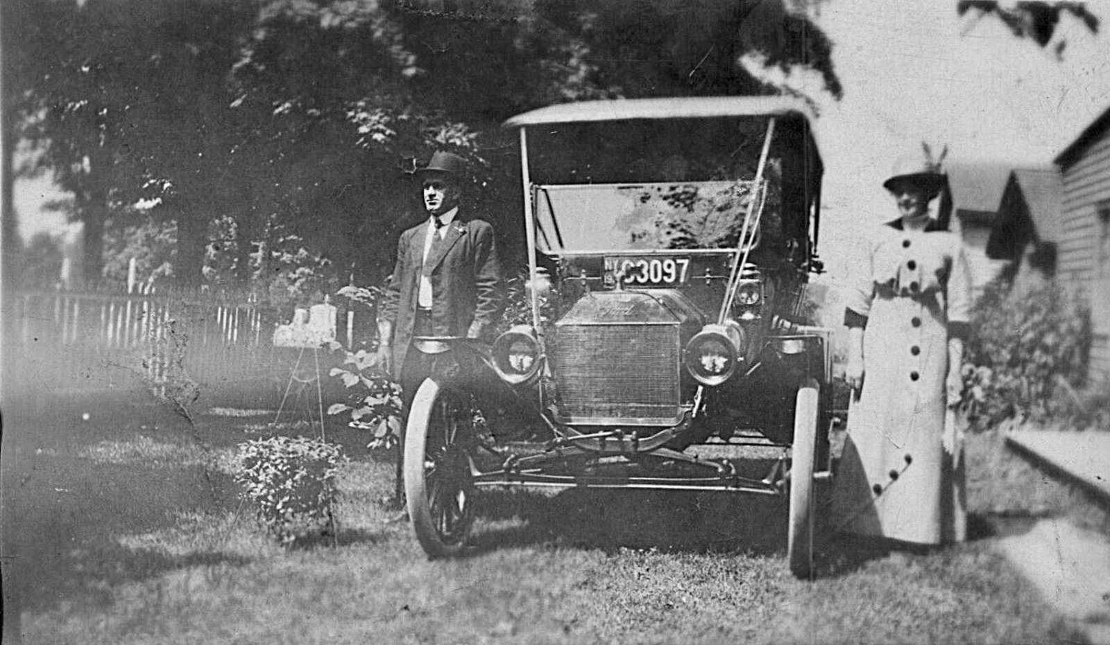 The touring car without a windshield? Is that a 1912? Pretty sure it is. Knobs on the spark and throttle levers, I think I can see the angled floorboard division, along with billed front fenders. I think a slab side with rear door handle outside.