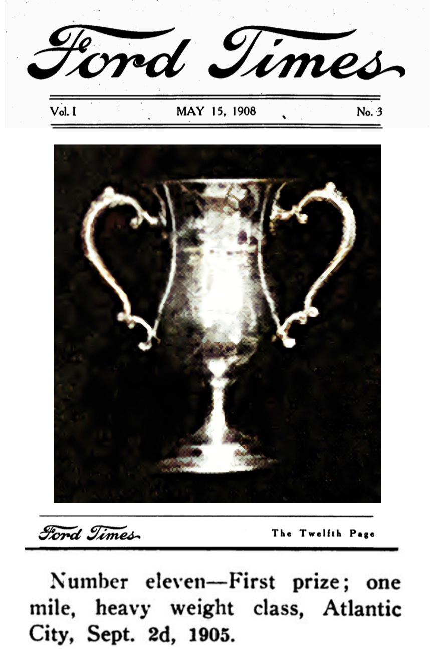 Atlantic City beach races, September 1905. Frank Kulick defeated A. L. Cambell driving his Darracq for this heavyweight class trophy. Ford had just set the Mile competition record against Cambell, but the Darracq team protested and the race was rerun.