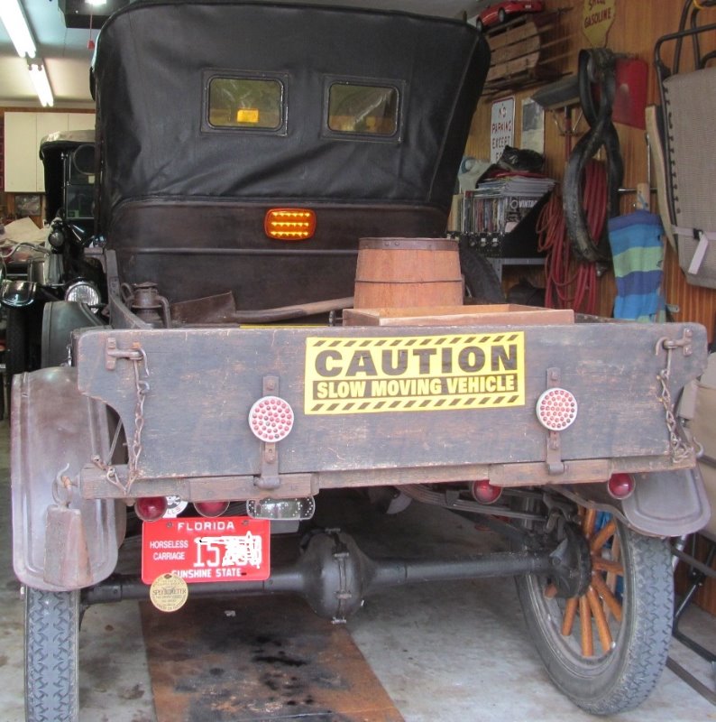 My T's have flashing lights in yellow, (magnetic attached) and big CAUTION signs (sticker or magnetic) for warnings, double brake lights, reflectors, etc... Many states call those Triangles for very low speed vehicles, under 20mph. Have never heard of another T'er being questioned by police on them, as in fact, the T when pulling a steep hill IS a 20mph vehicle