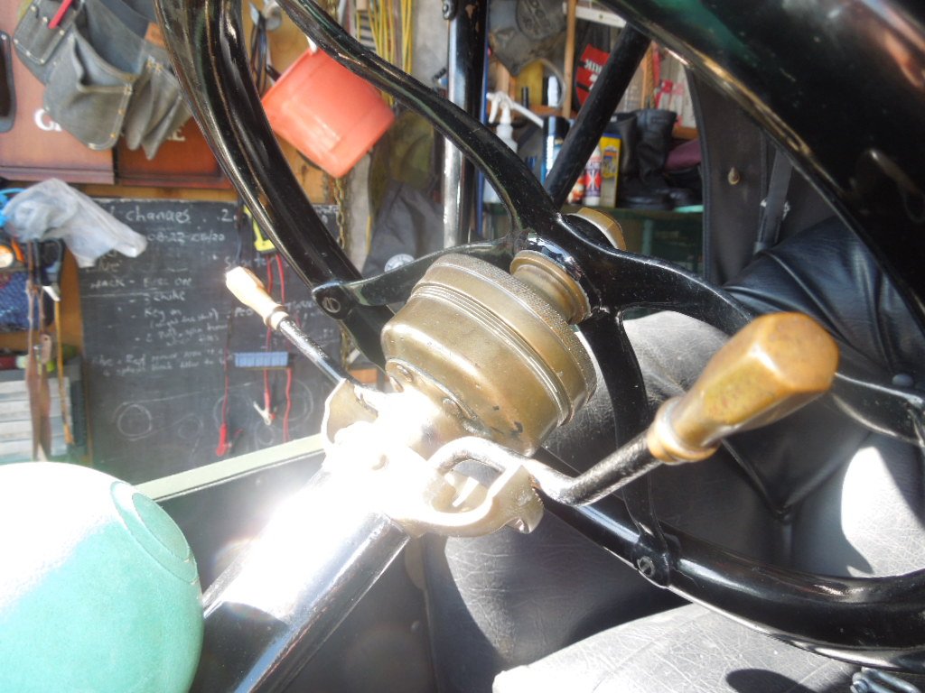 The wooden handles on the spark and throttle levers may be an indication that the column is earlier than 1913. The levers may be straight rods on the ends to take the hard rubber knobs used on early columns. Either that or some vandal cut off the original flattened ends.
