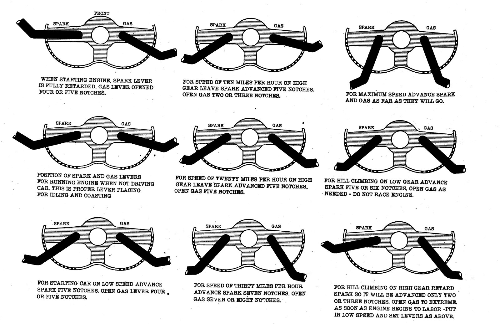 OK. I read all the descriptions of the spark and gas levers for the various T driving/idling conditions. And I only take issue with the bottom right illustration: Hill Climbing In High Gear...