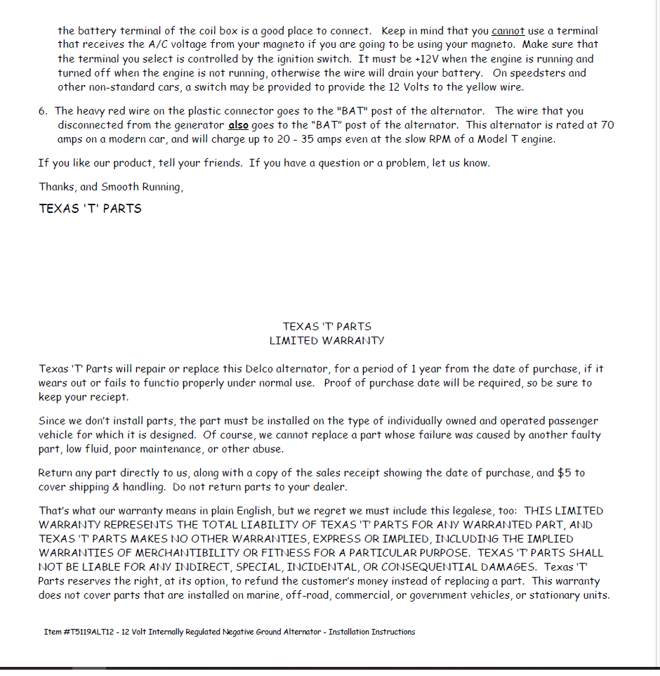 Here you go - retrieved from the WAYBACK MACHINE (an internet site that captures ALL web pages past & present)Tmooreheadf wrote: ↑Fri Dec 01, 2023 7:24 pmI’m trying to help a long distance newby friend with removing a Delco gear driven Texas T alternator that needs checked out. While for the most parts it works pretty darn good, periodically it has charging issues. Texas T used to have some nice downloads for their stuff, but I can’t seem to find a downloadable installation and removing instructions to send him. I know Birdhaven bought them a few years back but I didn’t realize all those free down loads were gone. Any help would be appreciated!