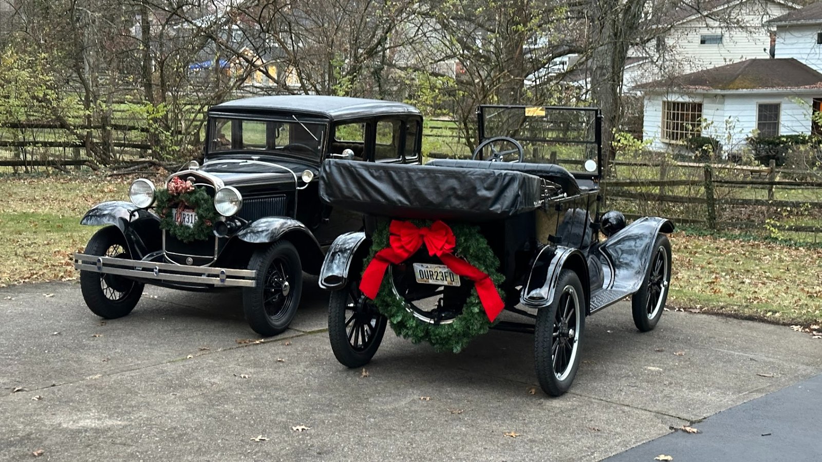 Helen, our Model A, received her front Christmas wreath. Hazel, our Model T, received her spare tire Christmas wreath.