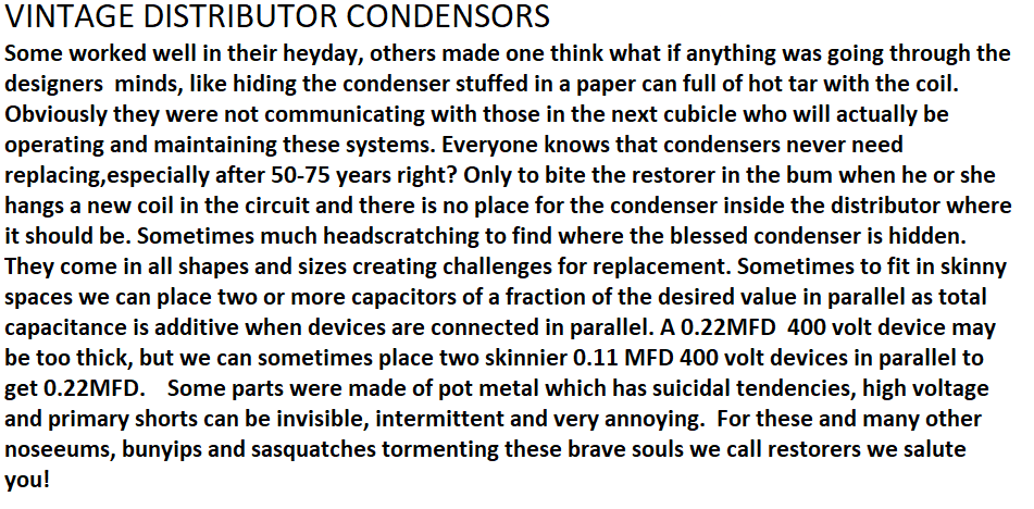 Several years ago on a 4 day 500 plus mile tour we spent several hours and many roadside stops babysitting two cars with bad condensers in VW distributors. There were six cars and on the way home on the last day with the trouble stops, we became two groups of 3 cars separated by about ten miles. We finally nursed the one I was following to a fairly large city with the full variety of auto parts chain stores. Nobody had a condenser. They all could order one and have in a few days. Finally a customer in one store told us of a guy who only worked on old VWs, so we went there. As we walked through the door with the condenser in our hand he looked up and said "Those are junk." We said we were well aware and wanted one that wasn't "junk," to which he replied, "They aren't available. I sold my last one and I'm trying to get some more. Everything is made in Brazil or China and none of them are any good. They're bad right out of the box!" He then sent us to an independent parts store that he was pretty sure might have one of the "junk" ones in stock. They had one and the car made it home. The other car was ahead of us somewhere and also broken down. He had already changed the condenser the first day with an old one in his toolbox and just like us, there were no new ones to be had, but they decided that it had been running better with the first bad condenser than it was now so he changed it back and sputtered on home.