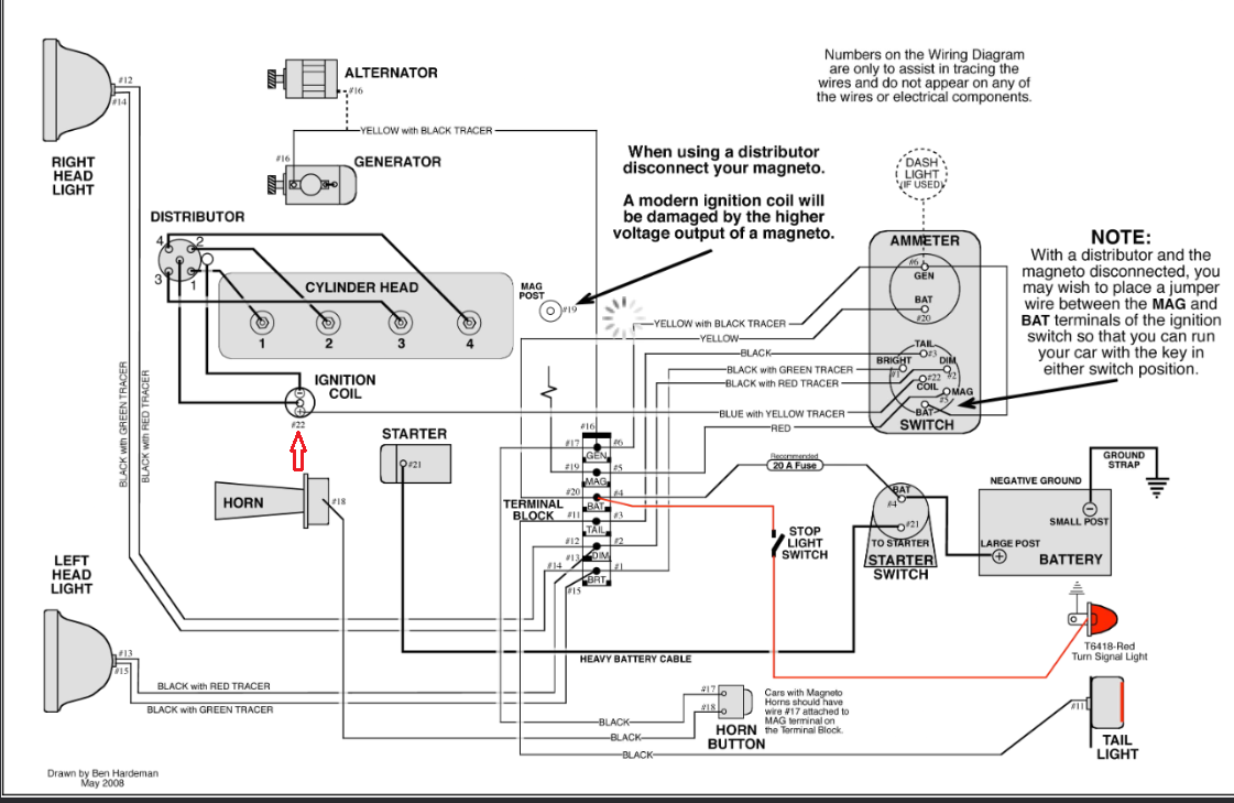 As to running the coils on 6 volts. I once ran one of my T's on 6 volt battery, and it ran, however, it was one of the slowest cars on a tour. Fixed the magneto and now it is one of the faster cars. The coils will work a bit better on 12 volts, but then you need to change the starter, lights, generator and everything electric. Some people change from generator to alternator. I have seen more cars with problems on tours with distributors and with Alternators. The Ford parts if kept in good condition, cause very few breakdowns on tours. If your magneto isn't working, you can go 12 volts or use an e timer or distributor until you need to do engine or transmission work which requires pulling the engine, and then repair the magneto at that time.