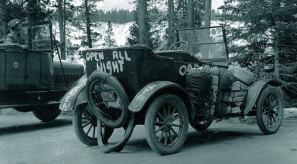 What a great photo from a different era. Certainly would have been an adventure. From the looks of the bus drivers posture he is looking at something. Probably his passengers feeding the bears :) . Today you would not be allowed to camp with that gear in most areas of the park, if any.