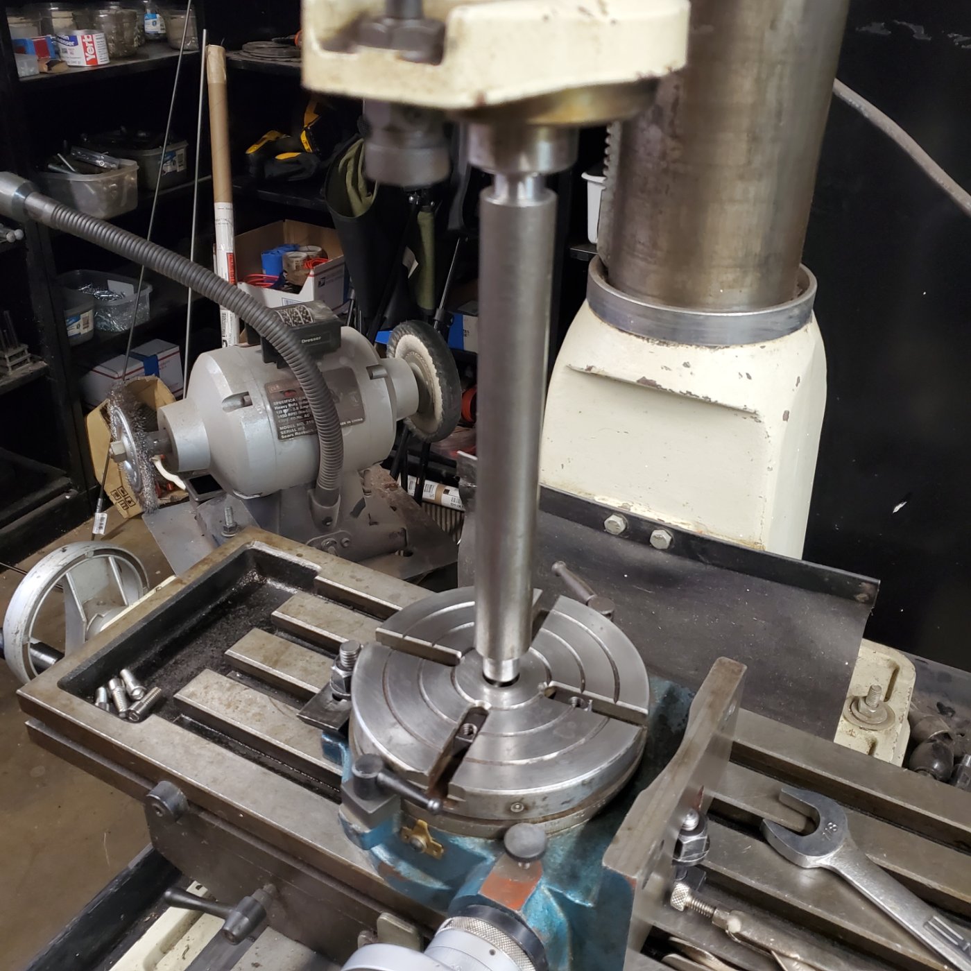 The last photo shows the sleeve and alignment rod lowered into the fixture with the quill after applying sleeve retainer. It was important that the fixture was not moved once the boring was complete so the sleeve would be centered in the bored hole.