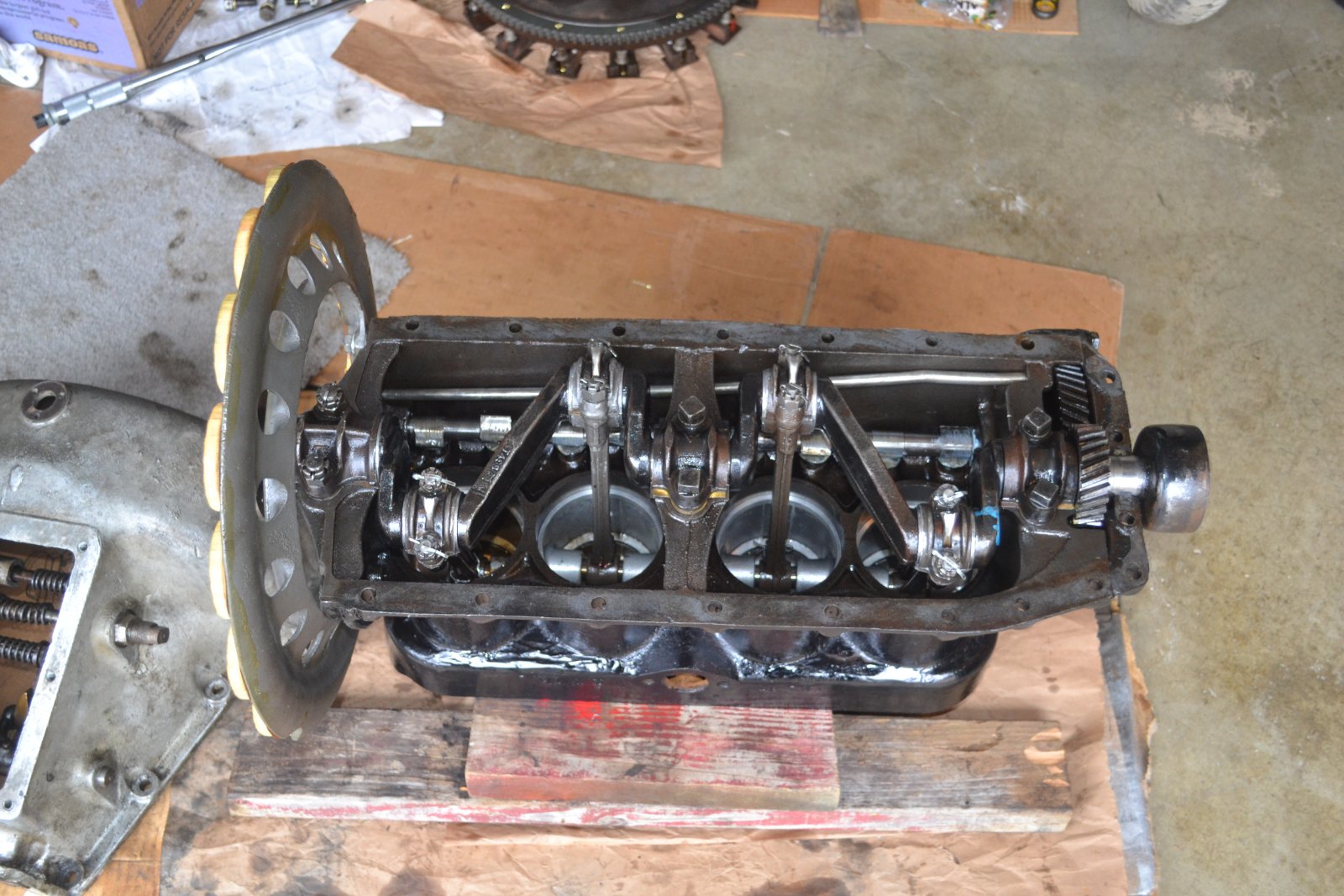 The tranny is also getting some attention. A new clutch spring was installed along with a new 4th main bearing ball cap and new triple gear pins and bushings.