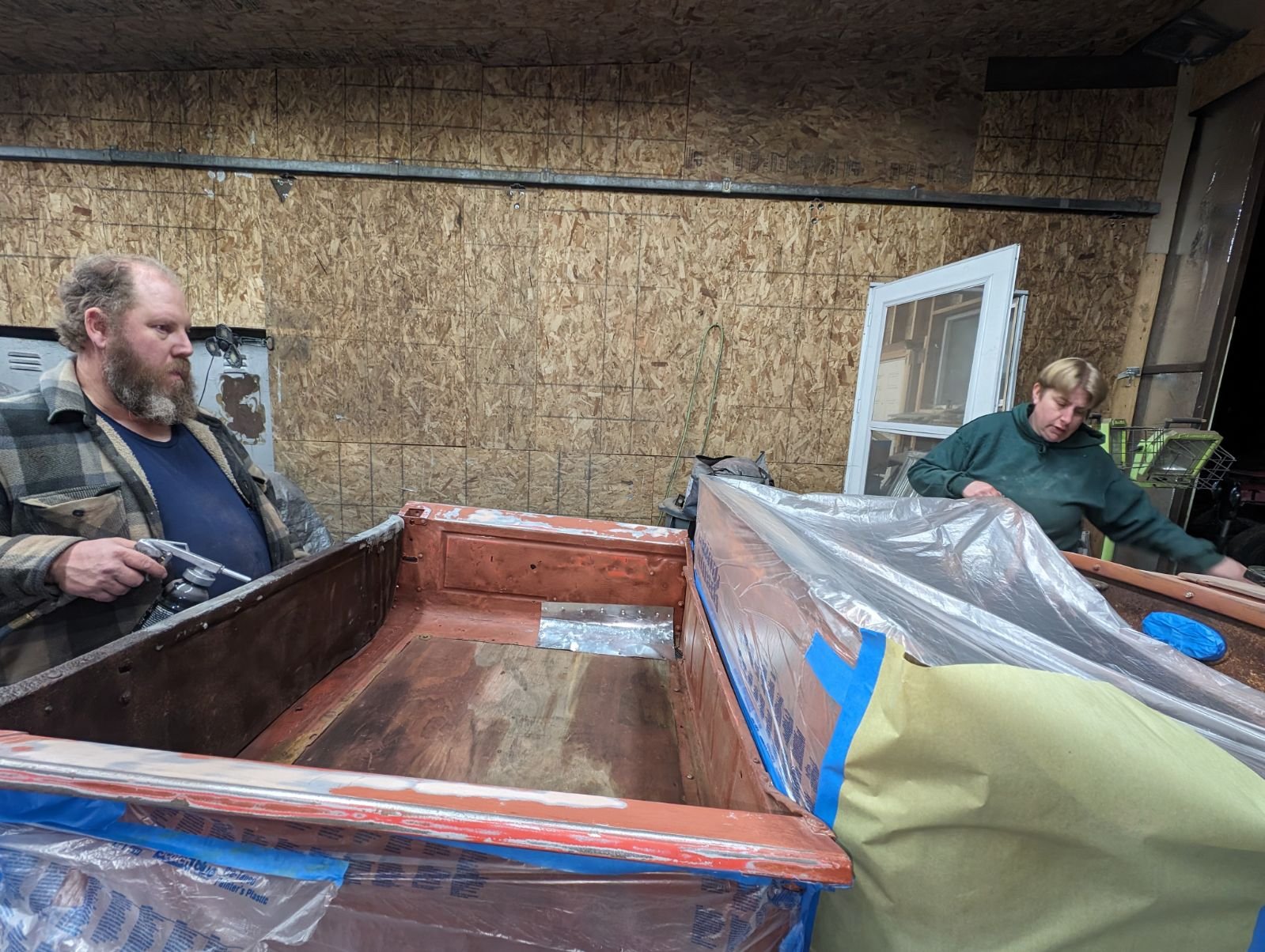 Today Carston and his mom Melissa, did the major body work and I made some new floorboards ( took way to long as I am not a wood worker!!!), made patches for the rusted out pickup box corners and pop riveted them in place. Finally we masked up the outside of the box and sprayed the inside with Raptor spray in bed liner.