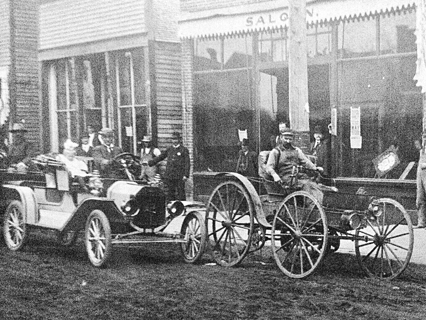 Number three appears to be a 1909 (gray) model t roadster sitting next to a somewhat earlier Holsman high wheel automobile.