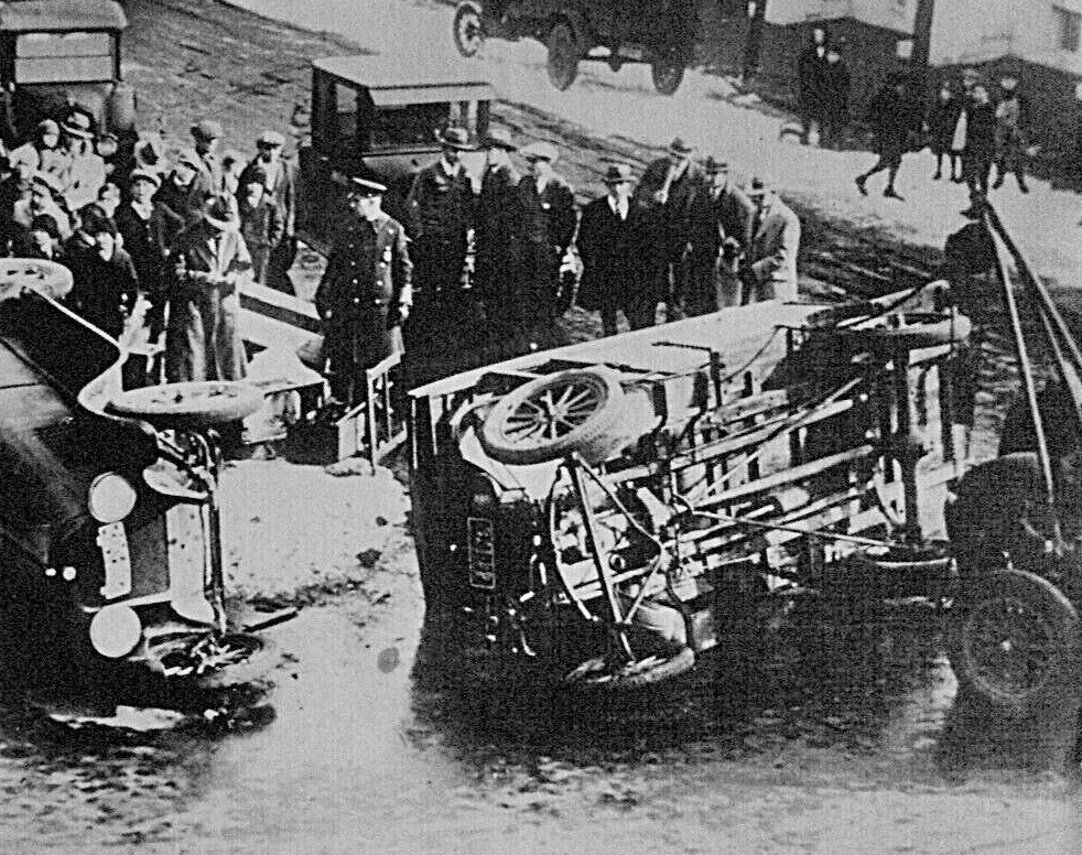 Number one, I don't know if college kids are clowning around or what they are doing? Everybody appears to be alive and well enough. Are they pretending to be victims of the "crash"? The right (top?) front wheel is spinning (slow shutter speed blur of the wheel spokes) and the fellow's hand and arm slightly blurred moving down away from the wheel.