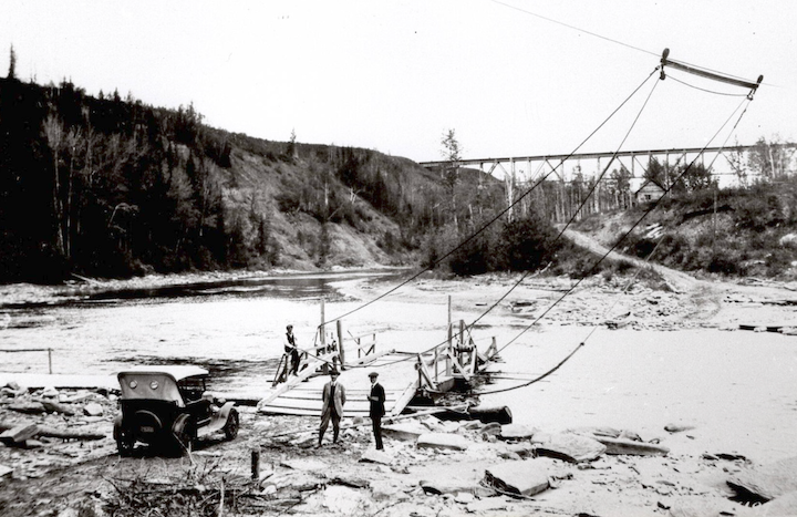 I think not, but I'm captioning this photo for our local club newsletter and would like to be sure. The photo is dated August 1921 and the setting is the Pembina River at Evansburg, Alberta. The ferry was replaced by a single-lane road bridge in 1923.