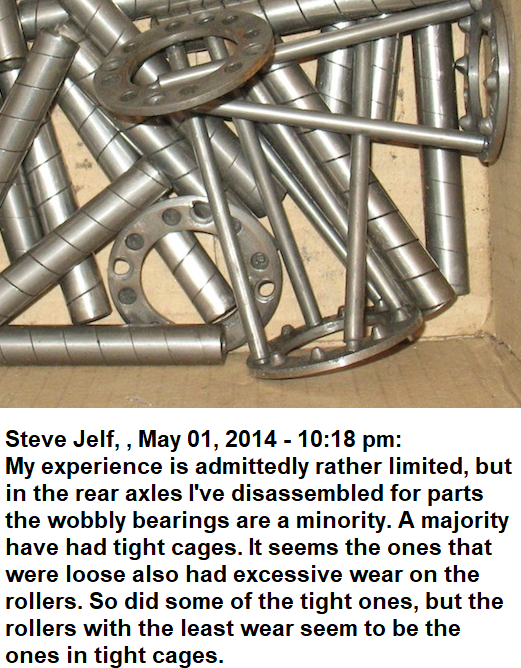 I find that loose caged rollers wear cigar shaped because the roller cocks out of its intended parallel position to the axle.