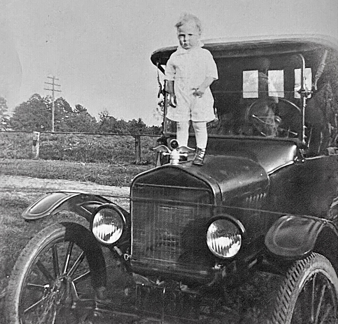 Picture number four has some interesting details. After studying it closely, I suspect the windshield has been changed to an earlier one. The windshield clearly has the even folding hinges used 1915 into mid 1917. However, the "H" lenses in the headlamps first came about very late in 1921. A reflection of the child's white clothing in the windshield makes it difficult to be sure what type of horn button the car has. The windshield to cowl mounting brackets appear to be late 1917 or later style with bolts in from the side. Limited detail and closeup not showing some things make it difficult to be certain of much. Can't be sure of earlier or later front spring/engine mount But the marginally visible front axle appears to have an under axle wishbone (mid 1919 onward).