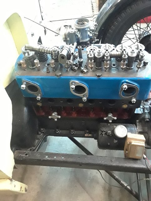Here is a photo from the Bill Smith collection of a Roof 8 valve head converted to overhead cam. The front and rear of the head has had holes drilled and plugged for water passages.