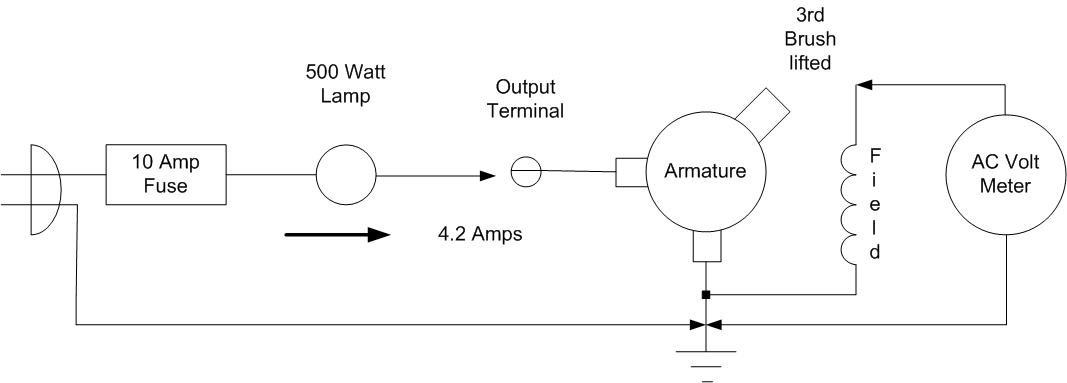 Seems easy enough, but sometimes the armature shaft will not rotate at any position of the brush rigging. Then I remembered how we used to set the brushes on DC machines at the power plant. AC current was passed through the field and AC voltage was measured at the output terminals. If the output voltage was more than 1/2 volt, the brushes had to be adjusted. I thought I'd try a variant of this on the Model T generator. Since this is basically transformer action, the source AC could be applied on the armature and the results measured at the field. Since the Model T armature can withstand more than 10 amperes, I used a 500 watt lamp to limit the current from the 120 volt wall outlet. Then with the 3rd brush raised, I measured the AC voltage at the field. Rotating the brush rigging, I could get 4 or 5 volts at the field and by rotating the brush rigging the resultant field voltage could be reduced to about 0.25 volts. I deemed this a success and will use this method in the future. Here is the circuit for my setup.