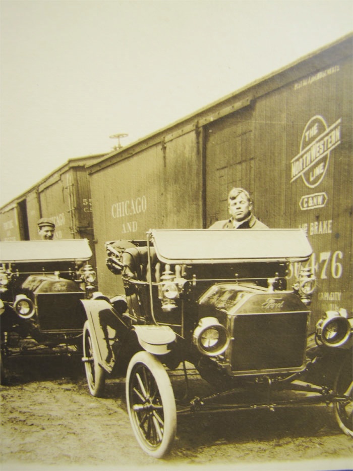 A couple of photos of the off-loading railway cars with newly assembled 1913 cars and chassis.