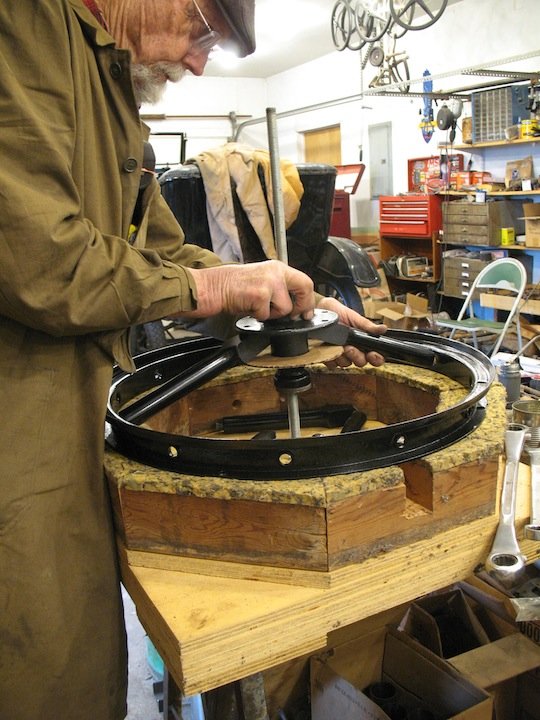 Canadian wheels are much easier to assemble. There is no need for a press. When the spokes are assembled ready to fit over the hub, the front to back taper on each spoke allows them to be tapped down with a mallet. First, those spokes with the wide side of the taper next to the hub backing plate can be tapped down somewhat, and then the alternate spokes with the wide side out can be tapped down to meet them. The process is repeated as often as needed until all the spokes are in position on the hub.