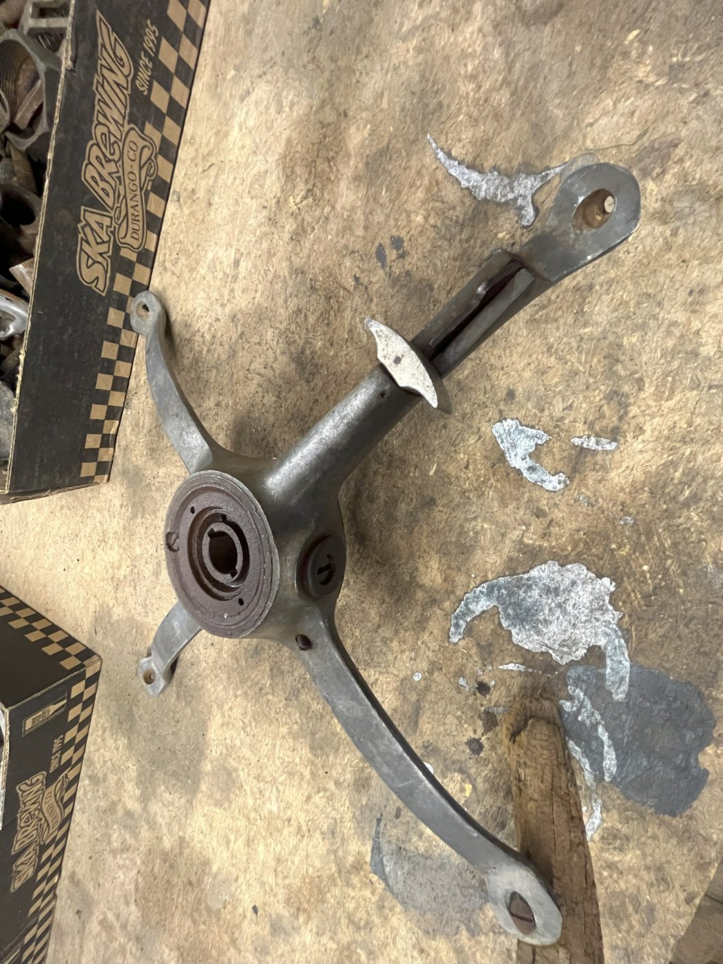 Mine looks just like the above photo that Frank posted from the old thread. To unscrew the cover you have to turn the set screw out about 3/8 to 1/2 inch until you can turn the cover a full turn. Pressing on any one of the fingers you see under the cover will activate the horn. If you’ve never had the wheel itself off, or if it’s been a long time since it was greased, be prepared to catch about 65 1/8” bearing balls from between the spider and the fixed housing. Fortunately you can get a package of 100 balls from McMaster-Carr for less than $5 (plus about $9 shipping