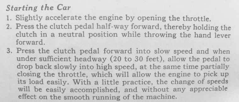 This gives velvet smooth shifts with no discernable clutch slippage. Once the car is moving at 15 MPH or so, depending on grade, etc, I move the spark lever farther down as needed. Both levers can be managed without taking my hands off the steering wheel or looking at them.