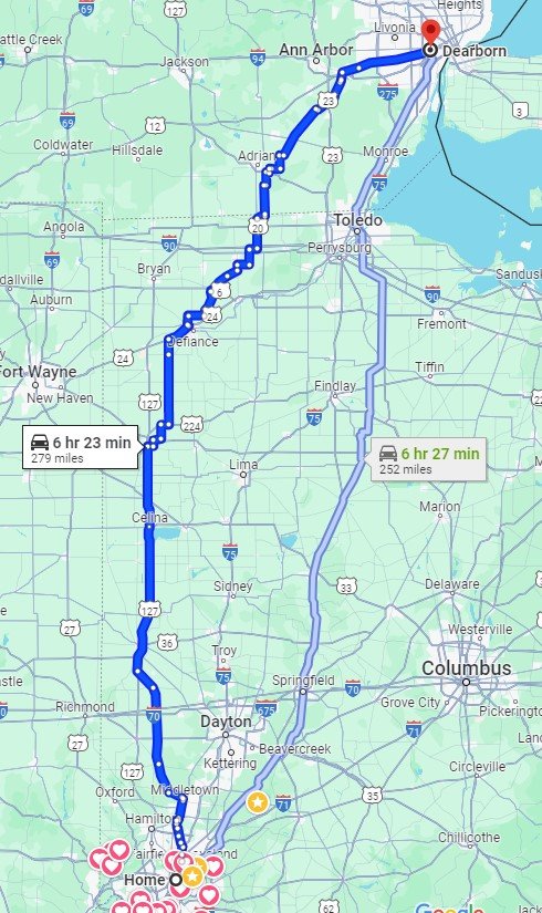 Exactly, I had looked at doing that for Cincinnati to Dearborn, and it puts you on a bike trail for a large portion of the time. I can go through and pull the route back to a "car road"... that will just take some time.