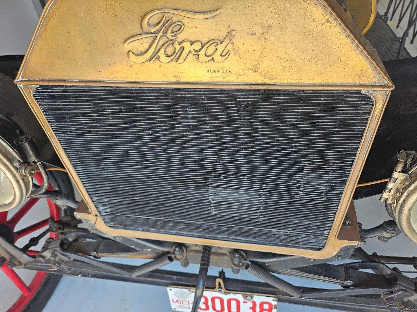 As for my theory of possible prior replacement in the early years, maybe from an accident, I don't see any signs of such in the frame, which is easy to spot. But... the radiator, most likely original, does show some major repair having been done, two large sections with new fins brazed in. Maybe took a light enough hit to damage just the radiator and leading fender edges??