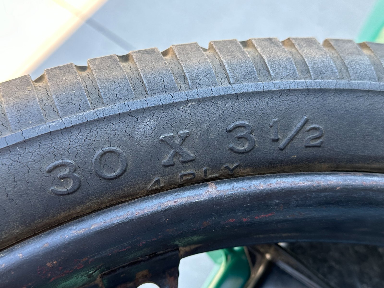 A few days ago I decided to remove that tire cover and see if I could figure out why the air leaked out as fast as it went in. What I found was The Samson Tire, 30 X 3 1/2, rock hard and still in great shape but for the age cracks.