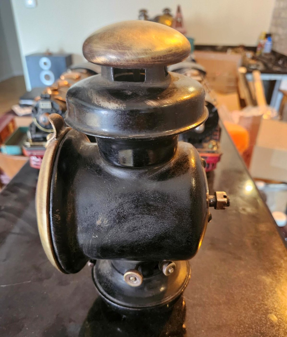 While similar in appearance to the later common 1915 style sidelamp? The only thing that is nearly the same and will interchange with the common later 1915 lamp is the lens and bezel itself. The body, inner and outer chimney parts look similar, but are slightly different sizes. The entire inside is very different as is the bowl and its locking method. Even the brass cap on top is different! It is slightly larger in size, and uses a size larger screw to attach to the chimney.