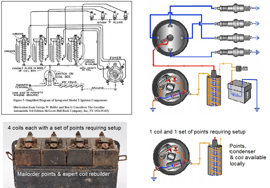 A model T coil fails and you have 3 more to get you to a good place to swap it out, or if you have a spare within arm’s reach, you might even be able to effect a repair without stopping. A coil on a distributor fails, and you’re dead where you stand until you replace it.