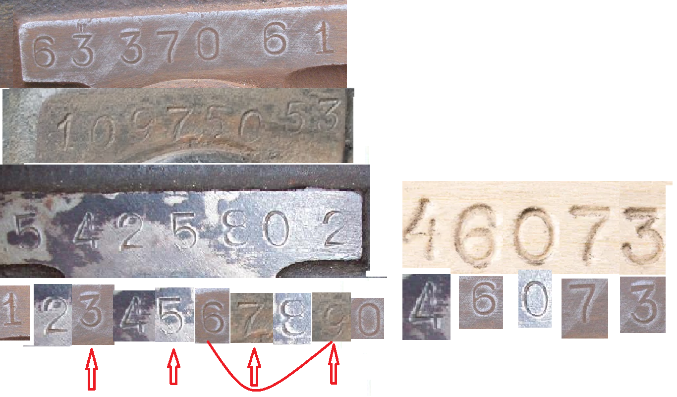 My set came from a restoration supplies emporium which catered for home renovators/restorers who wanted original fittings. A side line included old/collectible hand tools, and they had a large collection of stamps, both letters and numbers My numbers are about as close as you could get, except that the 1 does not have the little foot on it. I am not that anal about absolute detail that I have yet made a little tool to add that detail. However, they had no letter C in the size needed to prefix Canadian numbers.I did find a Q and a G of the same size, and with the help of a Dremel tool, these make a prefect impression.