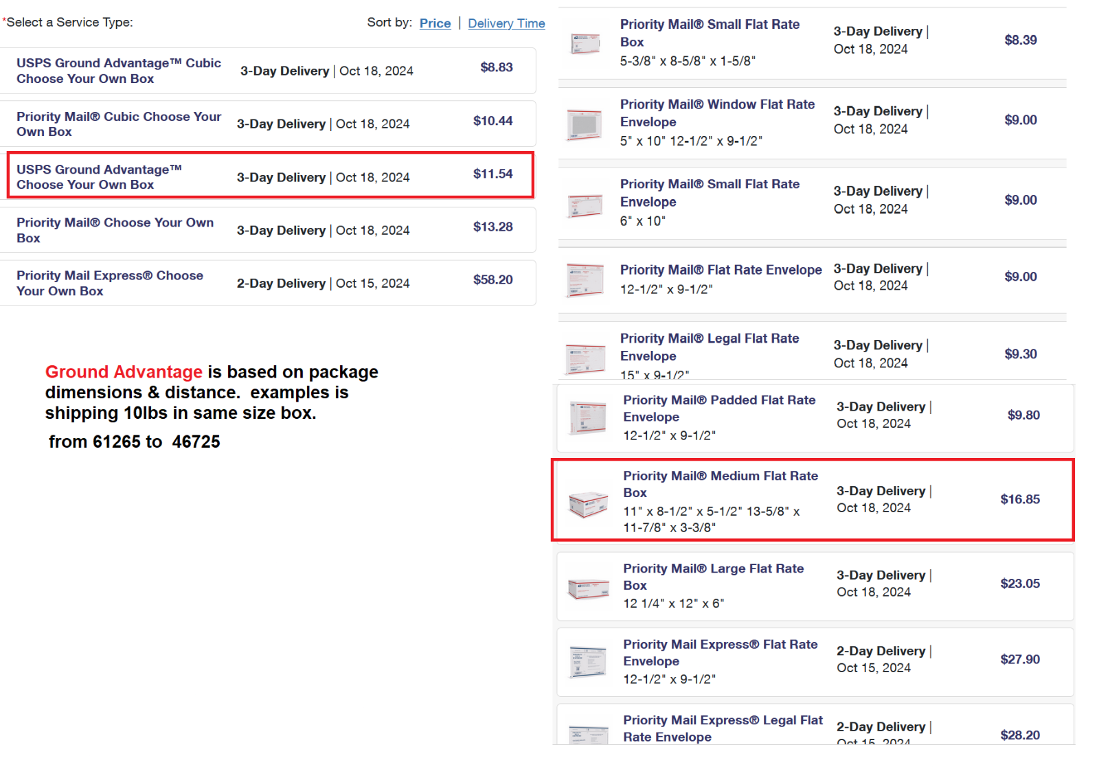Using the "Calculate a Price" to determine cost will give you the maximum cost. All examples are for shipping from 61265 to 46725, 10lbs needing a package 10"x7"x6"