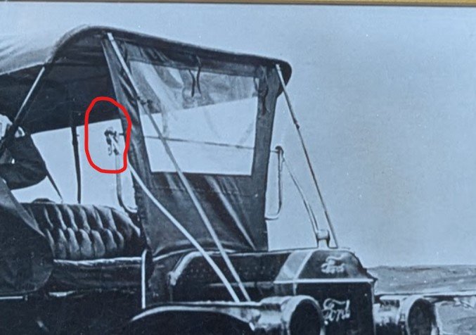 The car in the picture does appear to be a 09/10 based on where the front bow attaches. It also has a two piece firewall with the lower portion of the windshield attached. I zoomed in on the picture and circled the attach fitting for the missing upper windshield.Humblej wrote: ↑Sun Nov 17, 2024 2:31 pmIt is not a windshield weather guard. 1909 and possibly 1910 model year T's did not come standard with a top or windshield. Some tops had an integral roll up windscreen curtain attached in case there was no windshield, but if a windshield was also installed then there could be both.