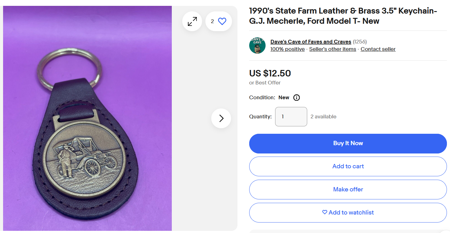 This confirms his is the founder "RARE Vintage 4" State Farm G.J. Mecherle (Founder) & Edward B. Rust (1918-1985) Keychain. Great addition to your collection - this may have been created and distributed to commemorate the passing of the company's CEO, Rust. in August 1985 or Merherle in 1951 --