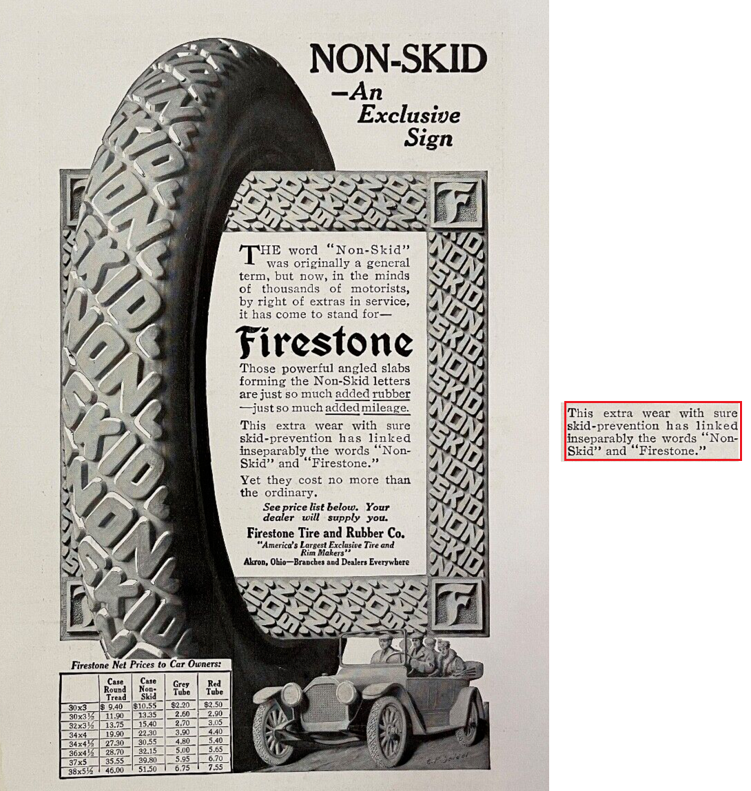 Theses ads indicate that the word "FIRESTONE" was also incorporated in the raised letters on the tires. Might be hard to validate